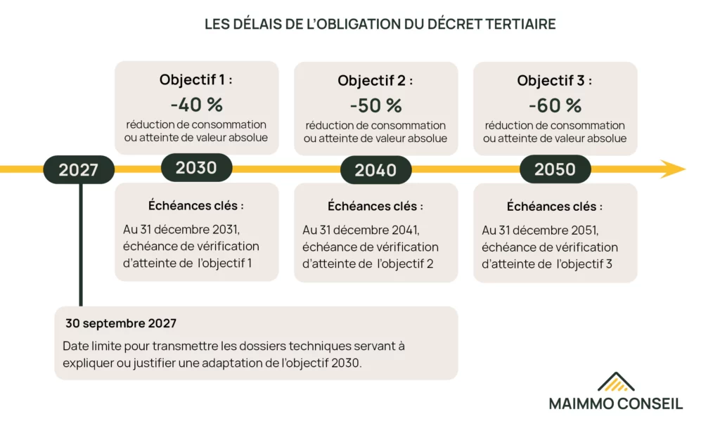 30 septembre 2027 : date limite pour déposer un dossier technique de modulation des objectifs si les contraintes techniques, architecturales, patrimoniales ou économiques rendent impossible l’atteinte des objectifs réglementaires.