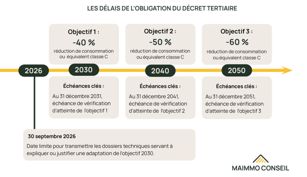 Le Décret Tertiaire impose une obligation de résultat avec des objectifs chiffrés de réduction progressive des consommations d’énergie finale :
